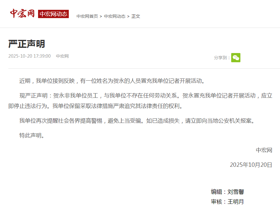 值得注意的是,10月20日《中宏网》发布严正声明,明确表示贺永非其单位员工,与该单位不存在任何劳动关系,其冒充记者开展活动已涉嫌违法。这一声明揭开了“记者”身份的伪装,却未解答其为何执意替污染企业删稿的疑问。无论贺永身份真假,其压制舆论监督的行为已构成对公共利益的损害,更与总书记关于黄河治理“一泓清水入黄河”的重要指示背道而驰。