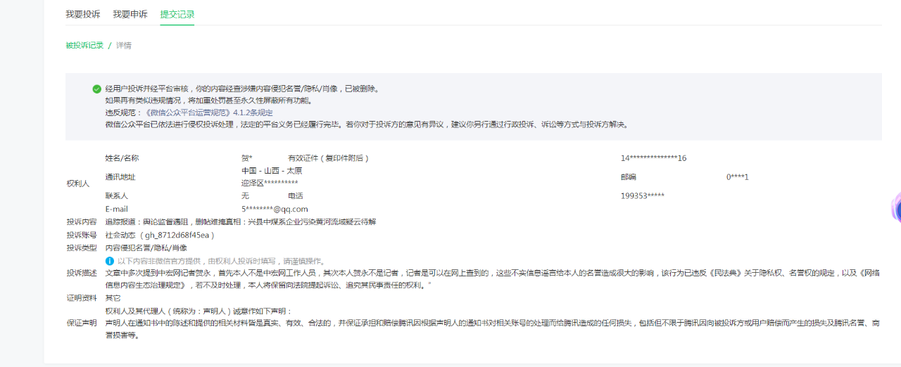 不甘沉默的“社会动态”随即发布追踪报道《舆论监督遇阻,删帖难掩真相:兴县中煤系企业污染黄河流域疑云待解》,深挖利益勾结与删稿内幕。这一次,贺永的反应更为激烈:公众号后台频繁收到投诉,稿件先是部分内容被屏蔽,随后其竟通过关系联系某县公安局网监部门施压。尽管基于污染事实的客观性,网监部门未参与干预,但贺永*终仍通过投诉手段导致整篇报道被删除。